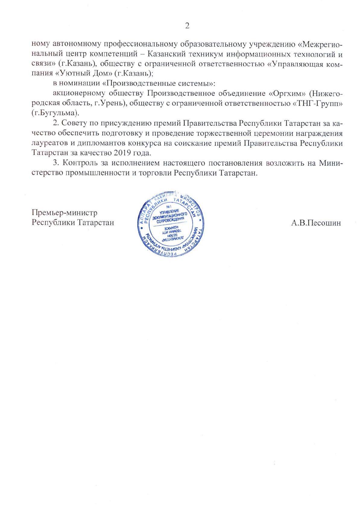 Постановление о присуждении премий Правительства РТ за качество 2019 года